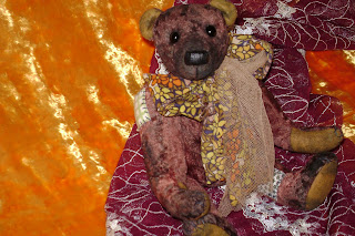 Мишка сделан по канонам мишек-тедди. Плюш, опилки, синтепух, стеклянный грануляр, пять шплинтов, стеклянные глазки нос вышит и покрыт ваксой, хлопок, кружево. Рост приблизительно 24см (не помню).